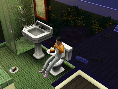 Heres Colin eating cake on the toilet, he has such a sweet tooth.